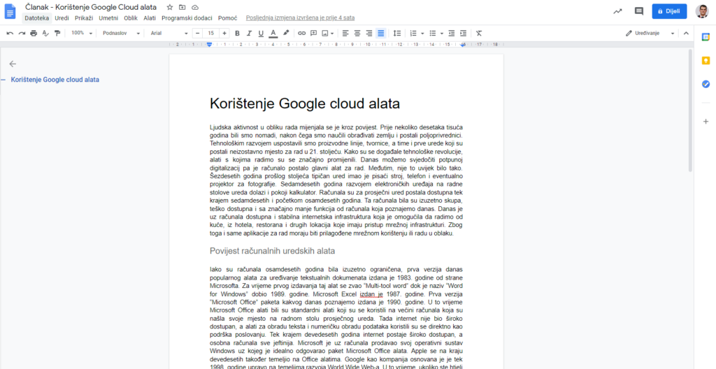 U slučaju sa slike niže, otvara se prozor za uređivanje Google Docs dokumenata. Korisničko sučelje aplikacije značajno se razlikuje u odnosu na Word ili Apple Pages. Međutim, dio vizualnih elemenata je vrlo sličan i vrlo brzo se je moguće priviknuti na korištenje aplikacije. Same funkcionalnosti aplikacija su veoma slične. Sve što bi ste očekivali da možete napraviti u aplikaciji Word možete napraviti manje ili više u Google Docs aplikaciji.